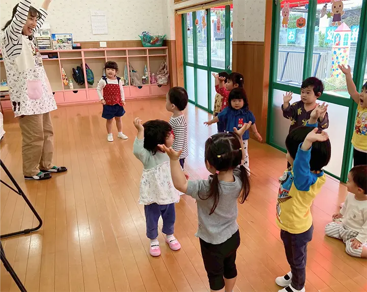 登園後、10時30分から朝の活動を行います。お名前呼びやみんなで朝のうた・季節のうたを歌って過ごしています。