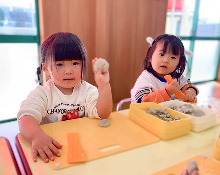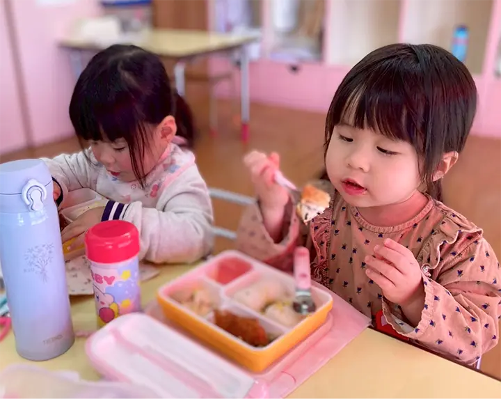 幼稚園と同じ給食を食べます。毎月の給食のメニュー・成分表を見ていただき、給食を食べる・食べないは日によってお選びいただけます。