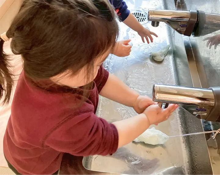 手を洗って給食の準備。幼稚園と同じ給食を食べています。スプーンやフォークを使ってひとりで食べられるように頑張っています!