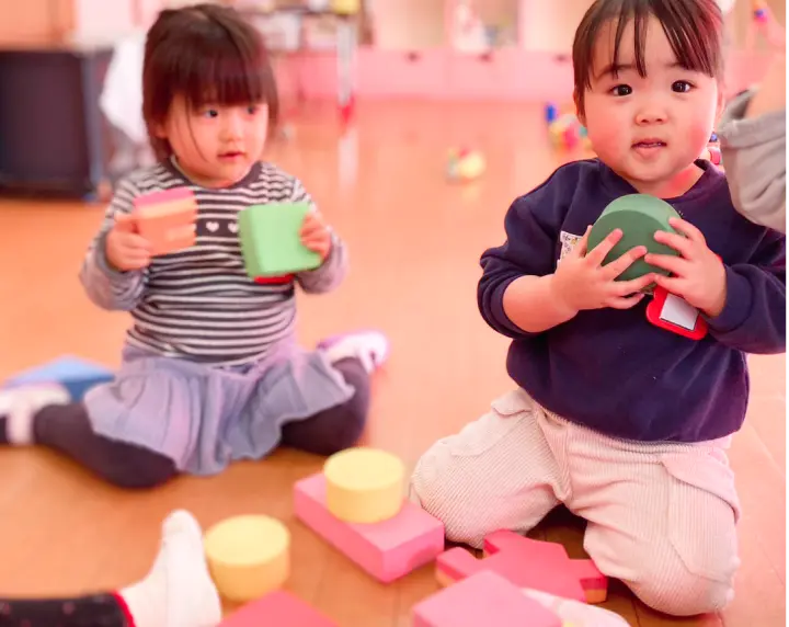 お天気の良い日はお散歩へ。室内ではお絵描きやブロック、おままごと等。気候や状況に合わせていろんな遊びを取り入れています。